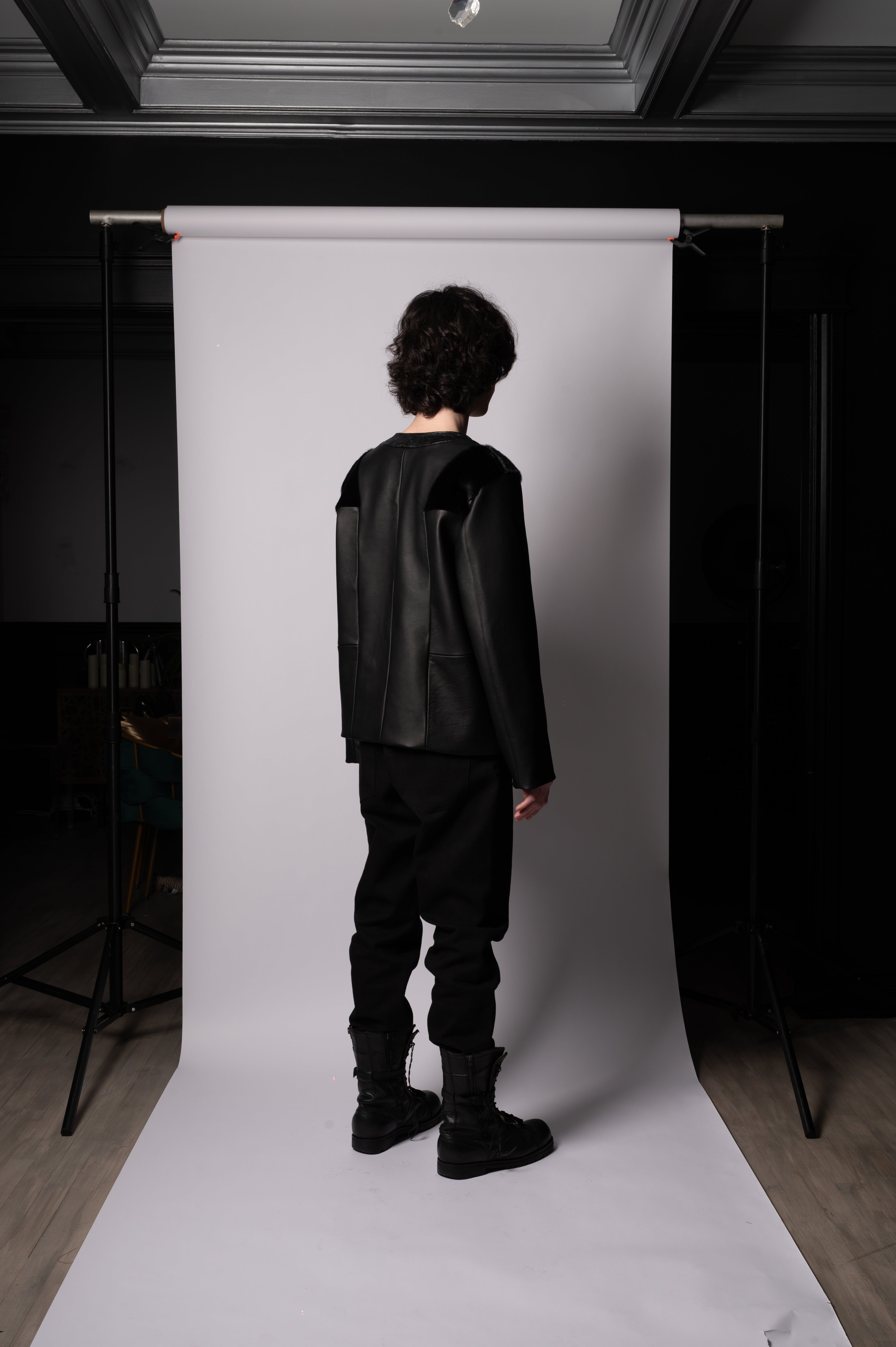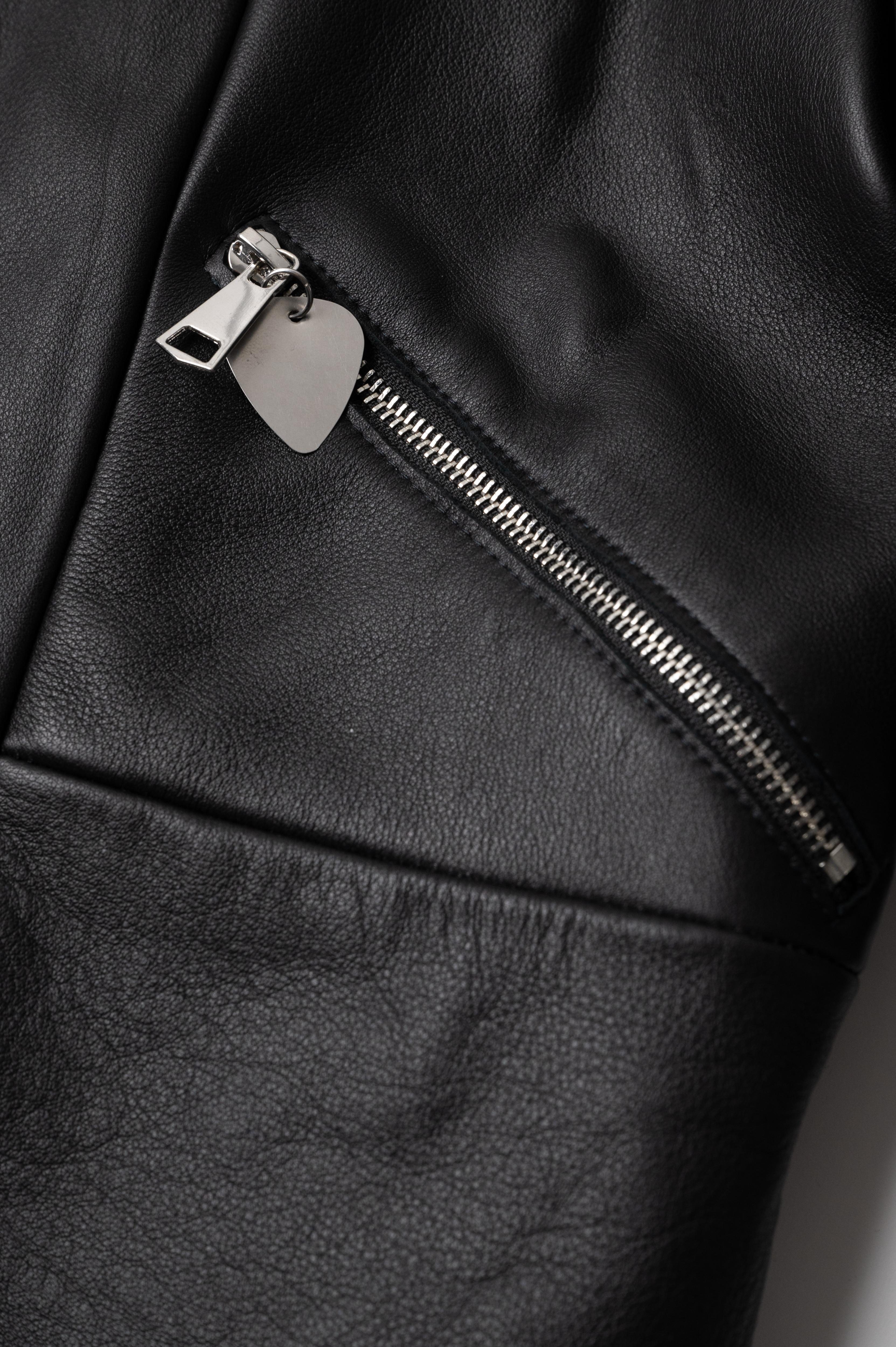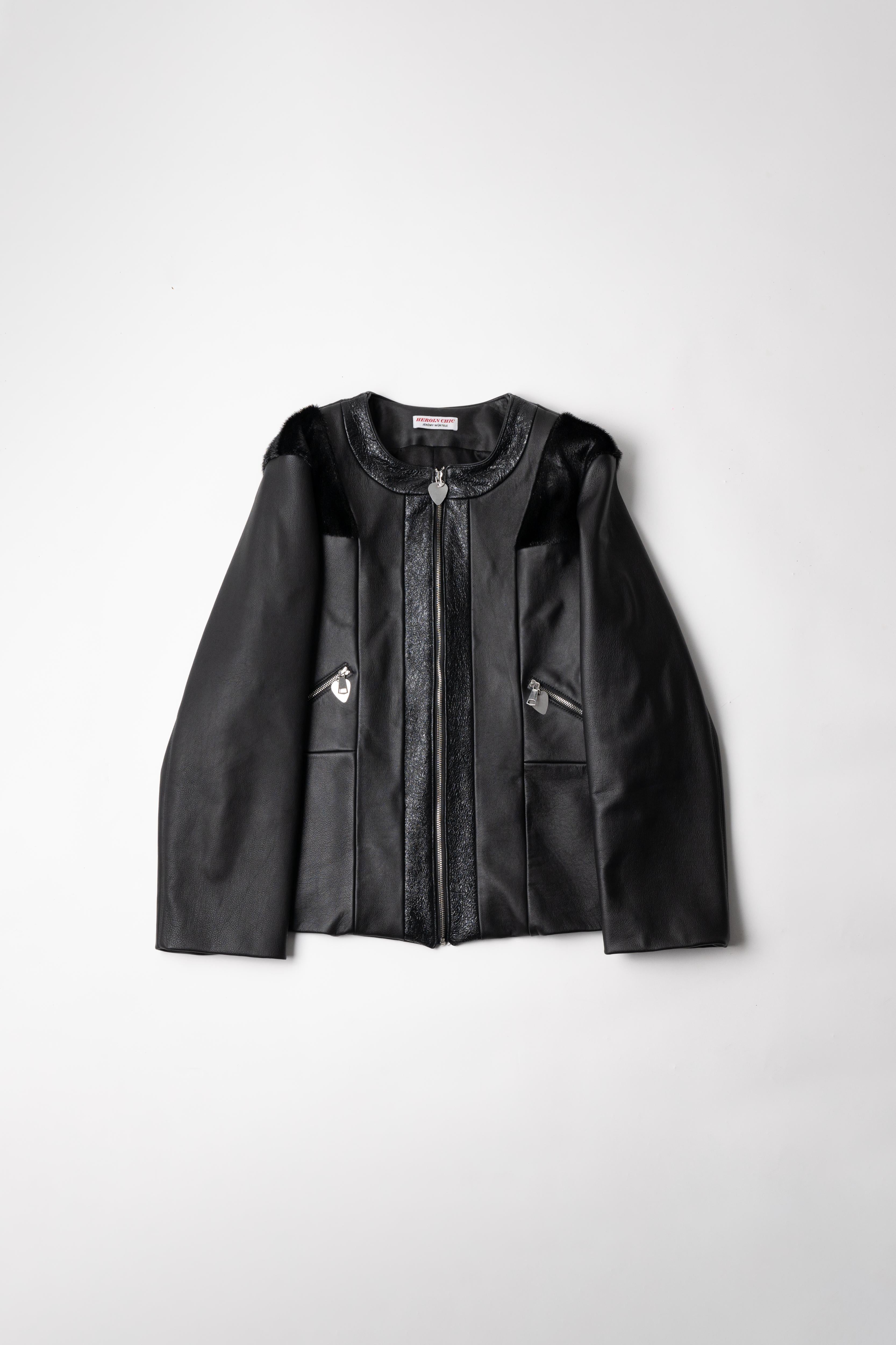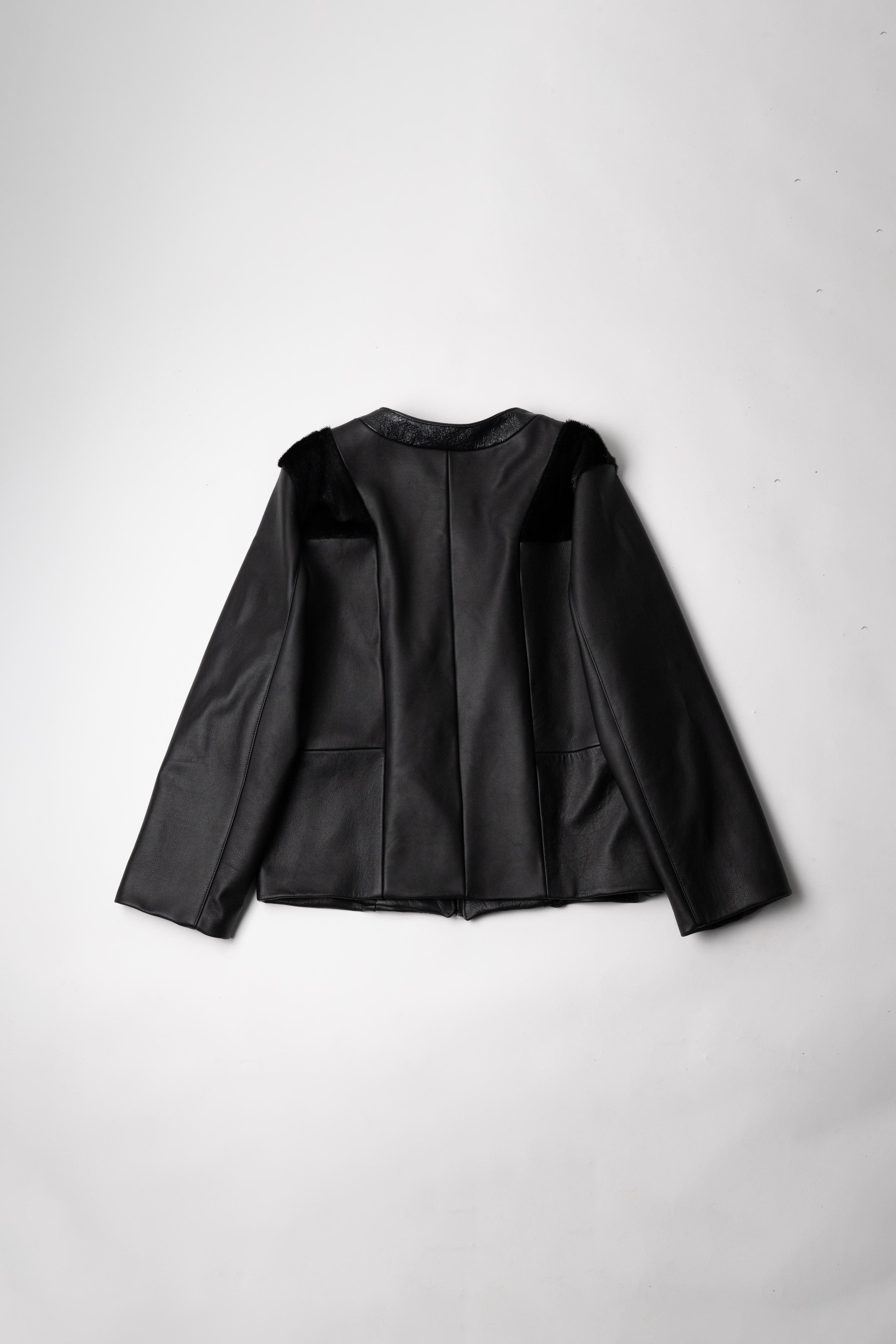 Black cowhide leather jacket. Shiny black cowhide leather accents around neckline and at center front. Round neckline...